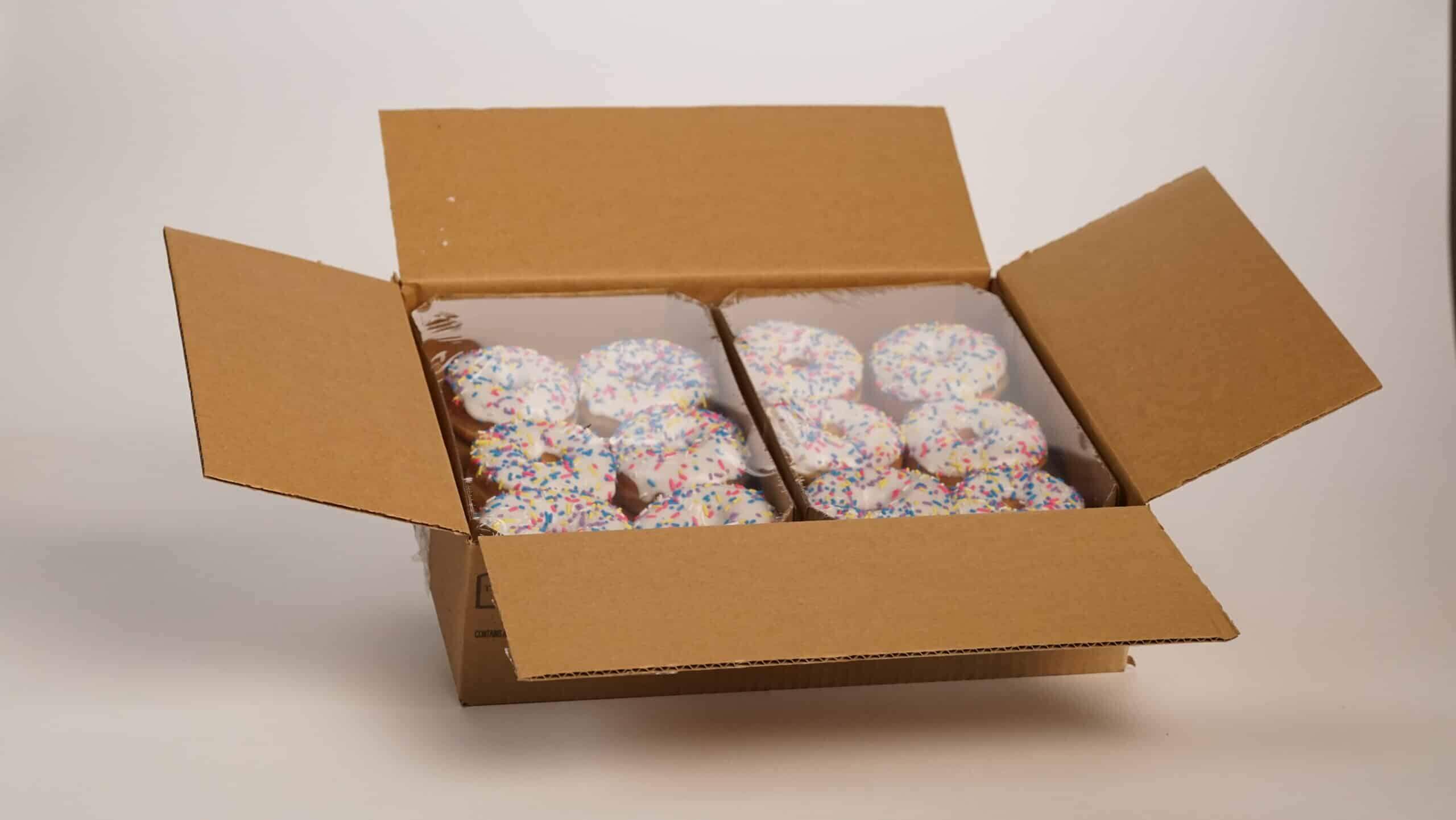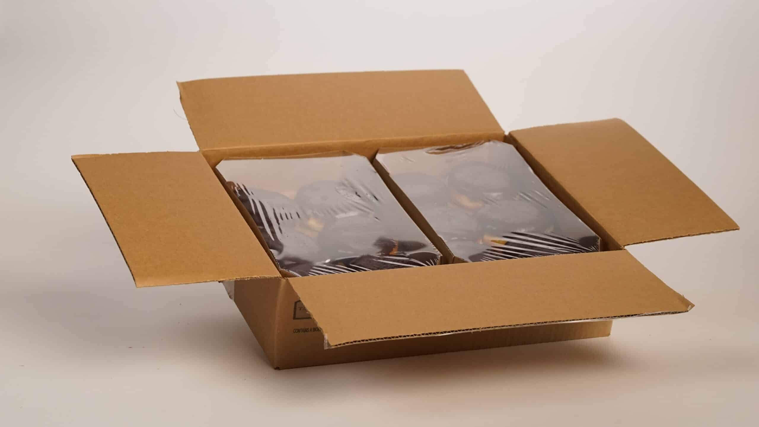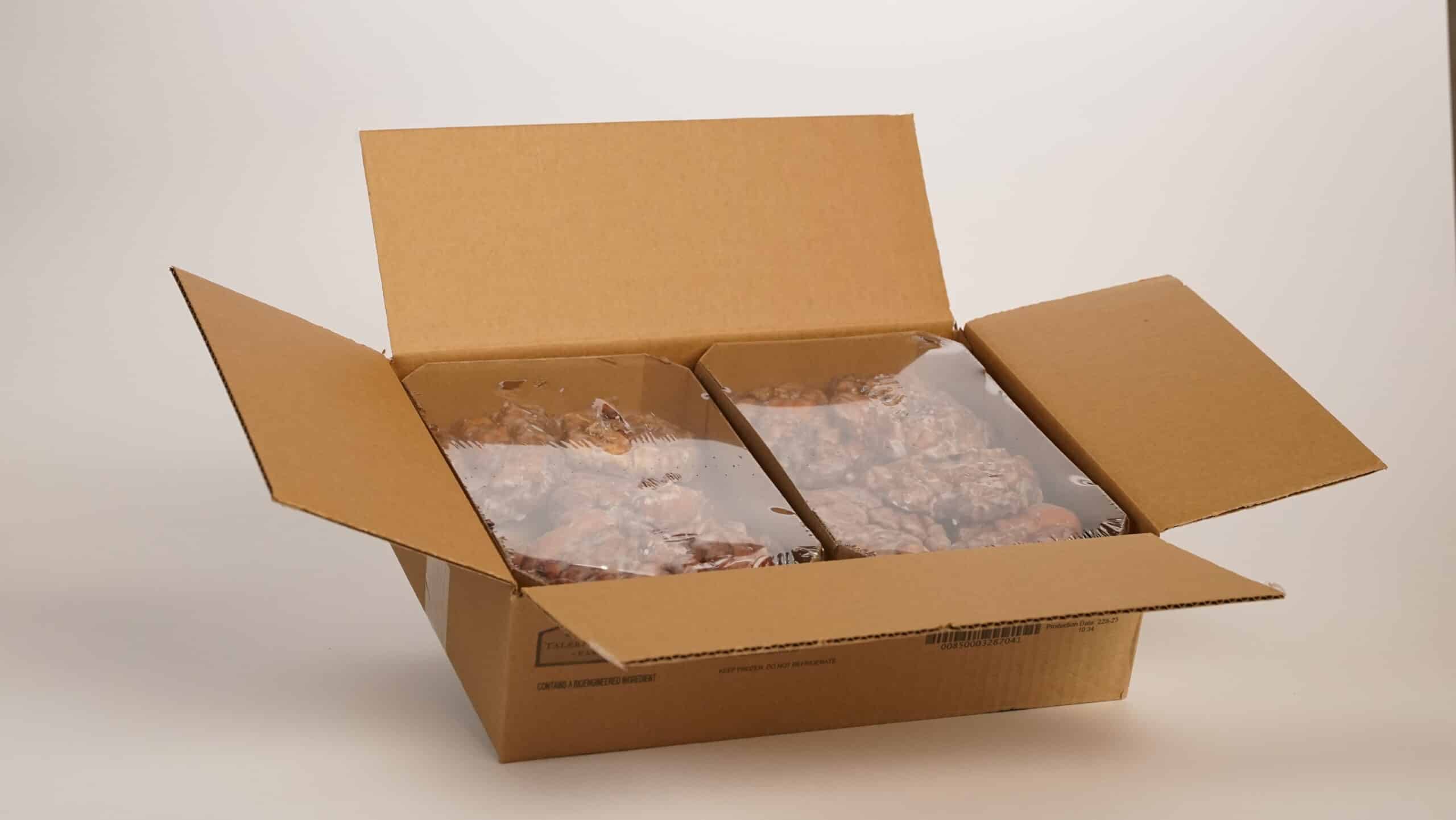 CORRUGATED OPEN-TOP TRAY WITH FOOD GRADE, SPRAY-APPLIED GREASE BARRIER. FDA LDPE PROTECTIVE SHRINK FILM OVER-WRAP. CORRUGATED MASTER CASE. 6 UNITS PER TRAY, 4 TRAYS PER MASTER CASE. -